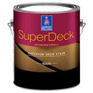 A gallon-sized container of exterior deck coating or stain product, manufactured by the Super Deck brand, and colored in Tricorn Black. This product is suitable for protecting and enhancing the appearance of outdoor wood surfaces such as decks, fences, and railings.