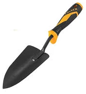 The garden trowel is a hand tool with a pointed, scoop-shaped metal blade and a handle, designed for digging, transplanting, and other tasks in gardening. Its uses include: