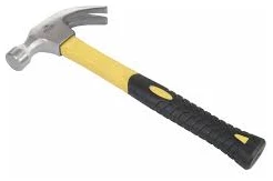 A hammer with a steel head and a fiber handle. This type of hammer is commonly used in carpentry, construction, and woodworking for driving nails, removing nails, and general-purpose tasks. The fiber handle provides durability and comfort during prolonged use.